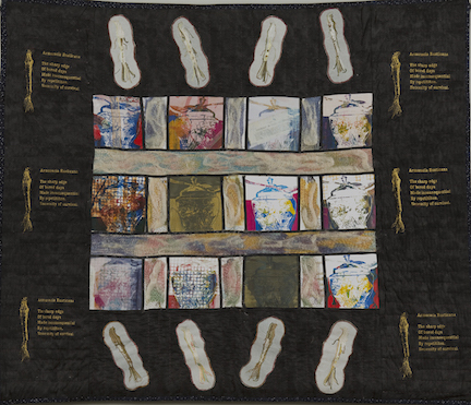 I feel like I’m still an art quilt newbie, experimenting with different methods of expression. Yet the design principles I learned as a painter serve me well in textile work and my old sketchbooks are a rich source of ideas for my new medium. I’m drawn to the colour, embellishment and tactile quality of the fibre, which are deeply satisfying to me.